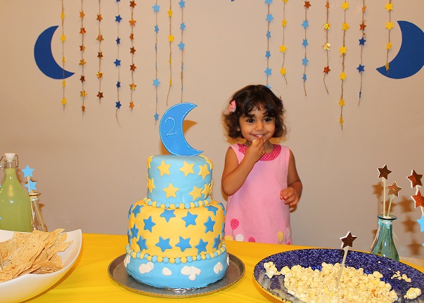 از یک هفتهی قبل من شروع کرده بودم به فکر کردن که چه کار هیجانانگیزی میشود کرد برای بچهی دو ساله که از تولدش لذت ببرد. آیه توجه زیادی به ماه و ستارهها و خورشید میکند. با تغییر ساعات روز مدام جلوی پنجره دارد نگاه میکند که خورشید یا ماه و ستارهها را پیدا کند. از همین چیزها، طرح ذهنی من از تولد داشت شکل میگرفت. شبها بعد از اینکه آیه میخوابید من مینشستم با پانچ ستارهای برایش ستارههای مقوایی درست میکردم که ریسه بسازم. ستارههای آبی و زرد و طلایی و چند ماه بزرگ سرمهای. سه شب طول کشید. شب قبل از مهمانی با وحید ریسههای ستارهای و ماهها را از سقف آویزان کردیم. یک سریاش هم مال دیوار پشت میز تولد بود که چسباندیم. از طرح و اجرا خیلی ذوق کردیم هردو. خوب شده بود همهچیز. صبحش که آیه بیدار شد و ماه و ستارهها را دید گفت دیدی تولدم شد؟ چشمهاش برق میزد.