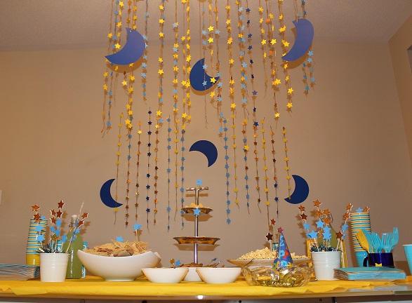 همان حین ریسه ساختن، فکر کیکش هم بودم. کیک کرهای خامهای با فوندانت زرد و آبی و ستاره و ماه. دو روز مانده به مهمانی کیک پختم؛ 1 قالب بزرگ، 3 تا متوسط و دو تا کوچک. فوندانت را هم همان روز رنگ کردم و ماه بزرگ روی کیک را هم ساختم چون باید چند روز هوا میخورد که خشک شود.